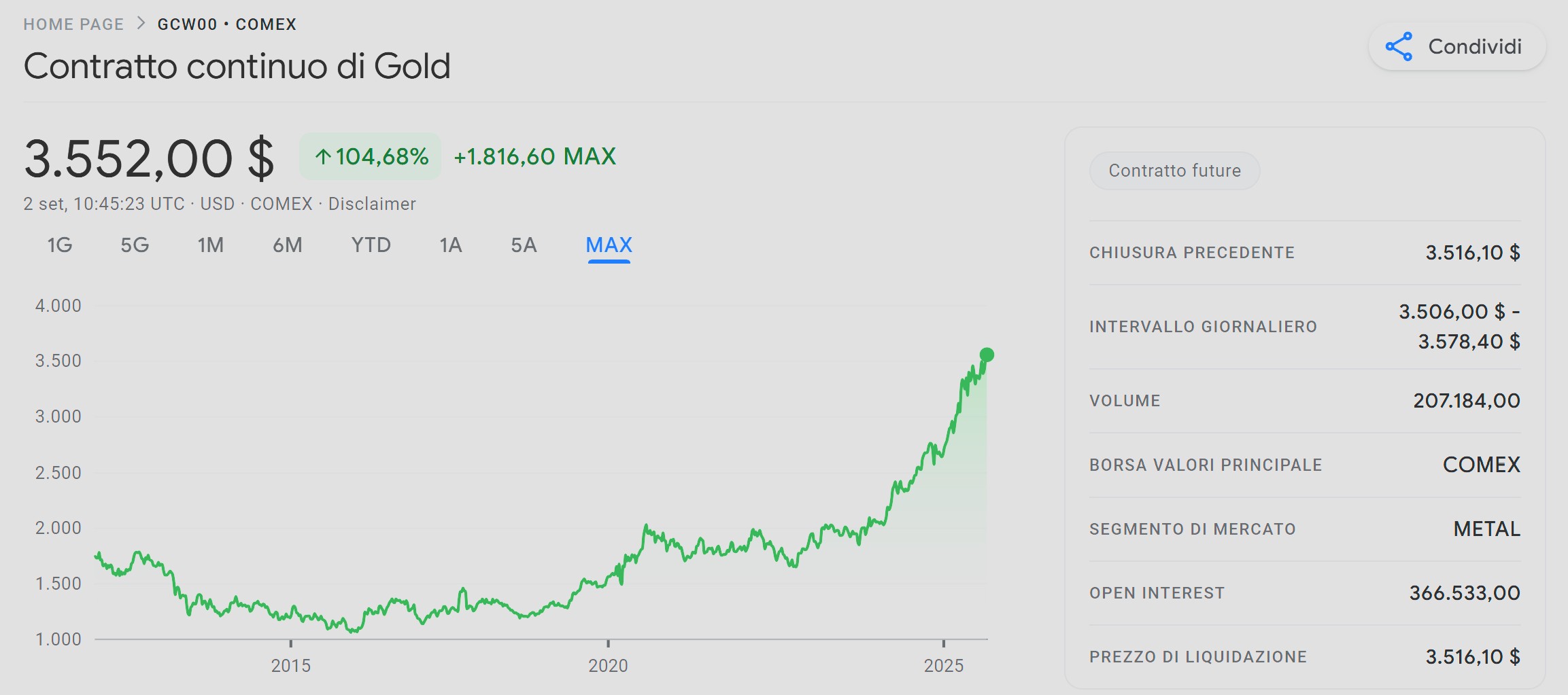 Inoltre, anche i futures sull’oro statunitensi hanno registrato un forte trend rialzista, raggiungendo il prezzo di 3.552,00 dollari l’oncia.