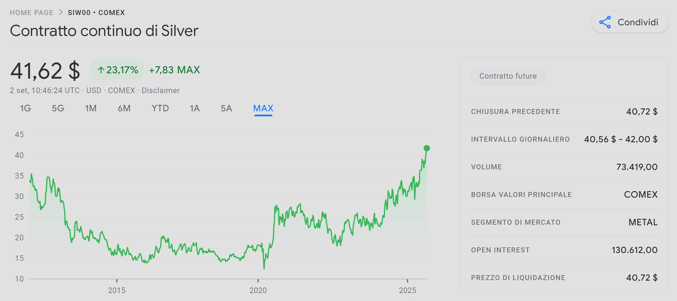 Anche il prezzo spot dell’argento ha registrato oggi un aumento di prezzo dell’1,6%, raggiungendo il suo massimo storico dal settembre 2011. Attualmente, il contratto future sull’argento viene scambiato a 41,62 dollari e si ritiene che l’aumento rispecchi il rialzo dell’oro.