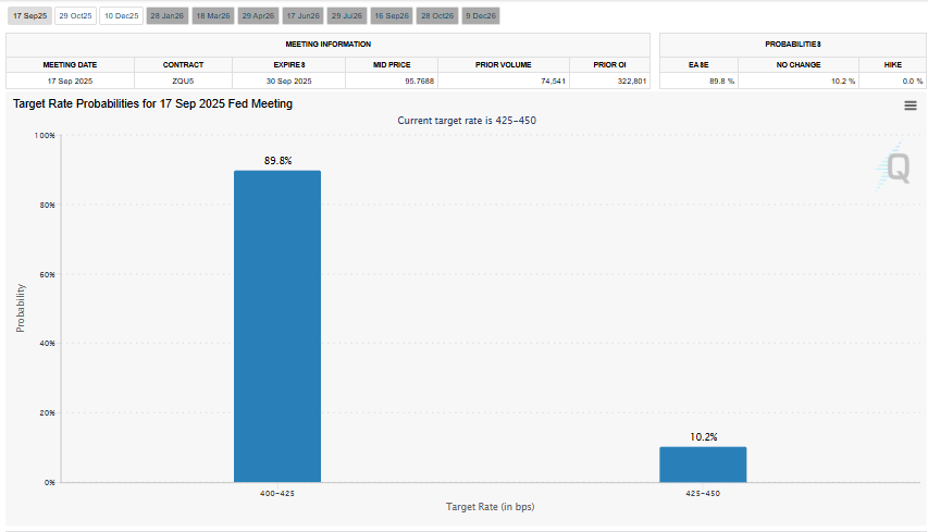Con l’avvicinarsi della riunione del FOMC, prevista per il 16-17 settembre, gli investitori guardano con attenzione alla potenziale decisione della Fed di un taglio di 25 punti base. I dati dello strumento CME FedWatch mostrano una probabilità dell’89,8% di un taglio dei tassi, mentre Polymarket e altri strumenti mostrano probabilità del 90% o superiori.