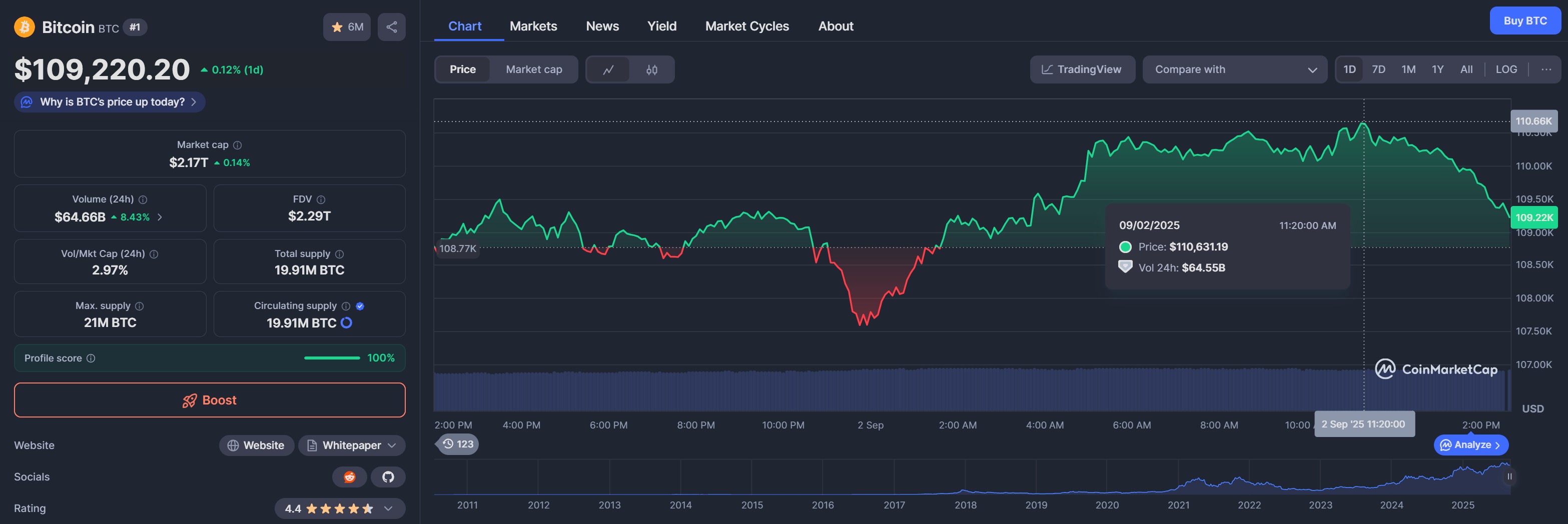 Al momento della stesura dell’articolo, Bitcoin era scambiato a 109.220 dollari con un leggero aumento dello 0,12%. È interessante notare che il token si sta riprendendo dal crollo del mercato delle criptovalute di agosto, quando il prezzo di Bitcoin è sceso al minimo mensile di 108.000 dollari.