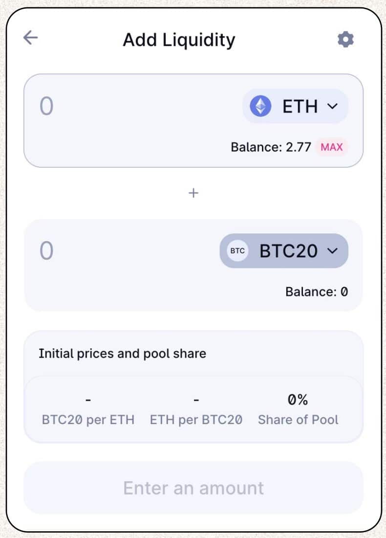 Ora è sufficiente inserire la quantità di ETH che si desidera fornire. Uniswap lo convertirà automaticamente in WETH (Wrapped ETH) e inserirà il corrispondente importo equivalente in BTC20 della coppia di trading.
