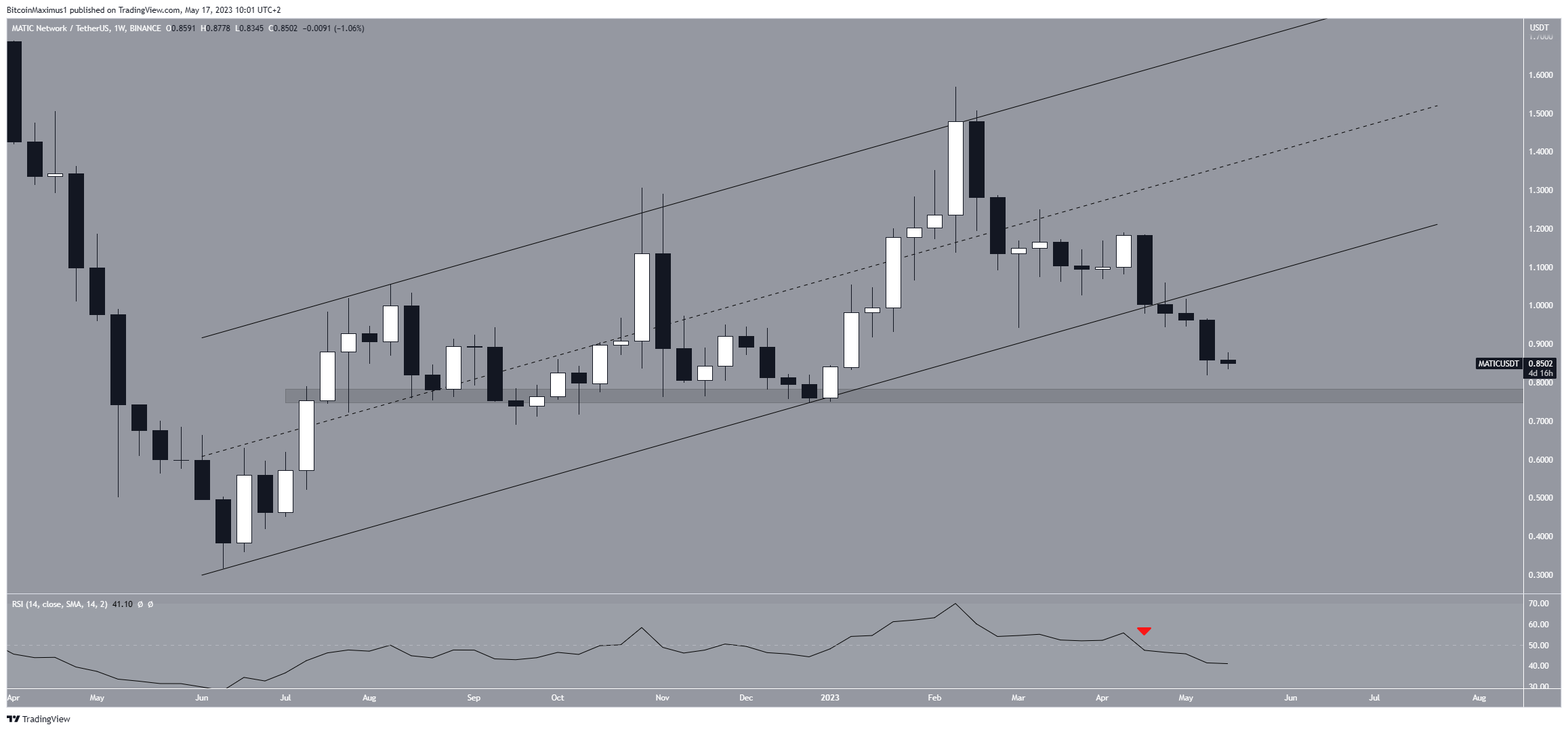 Il time frame settimanale fornisce una lettura ribassista per il prezzo del token di Polygon. MATIC è stato scambiato all’interno di un canale parallelo ascendente a lungo termine dal luglio 2022.