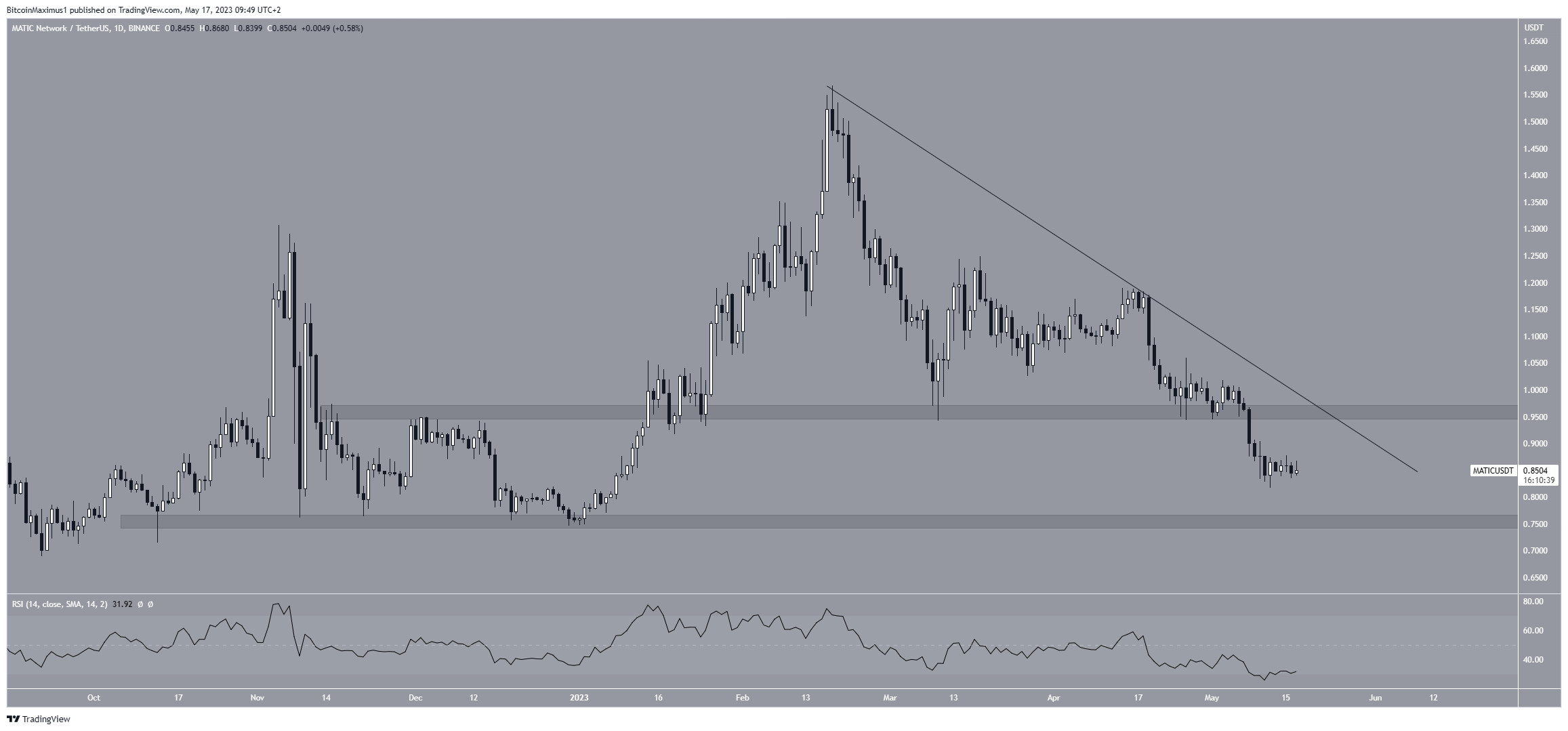 Il prezzo di Polygon (MATIC) è sceso al di sotto di una struttura a lungo termine, suggerendo che l’intero movimento al rialzo dal giugno 2022 è terminato. Inoltre, l’azione dei prezzi su base settimanale e giornaliera e le letture dell’RSI sono in linea con la possibilità di un ulteriore ribasso verso i livelli di supporto più vicini.