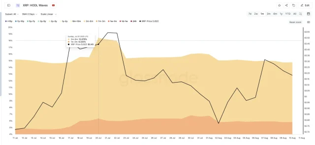 Le HODL Waves raggruppano l’offerta in base alla durata del possesso dei token. Due gruppi recenti stanno diminuendo rapidamente. Il 20 luglio, i wallet che detenevano XRP da 3 a 6 mesi rappresentavano circa il 12,07% dell’offerta; il 10 agosto questa percentuale è scesa all’8,93%. Il gruppo da 1 a 3 mesi è passato dal 6,78% dell’1 agosto al 5,83%.