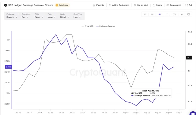La recente riduzione delle HODL Waves “giovani” coincide con un aumento delle riserve di XRP sugli exchange, ovvero la quantità di token XRP disponibili sulle piattaforme crypto. Un aumento di queste riserve significa che una maggiore offerta è immediatamente commerciabile.