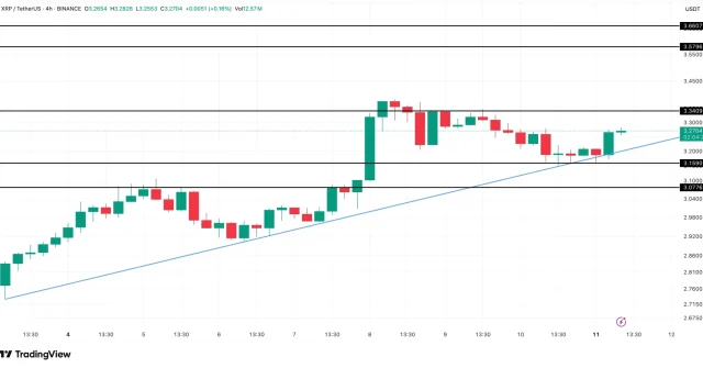 Il prezzo di XRP mostra sul grafico a 4 ore un triangolo ascendente, una formazione caratterizzata da minimi crescenti e una resistenza relativamente piatta. La resistenza orizzontale si trova intorno a $3,34. Oltre tale livello, i target sono a $3,57 e al massimo storico vicino a $3,66.