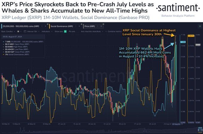 I dati di Santiment supportano in particolare le prospettive rialziste di XRP. All’8 agosto, la capitalizzazione di mercato di XRP è aumentata di un impressionante 23% in 24 ore, segnalando un rinnovato interesse e fiducia degli investitori nell’asset.