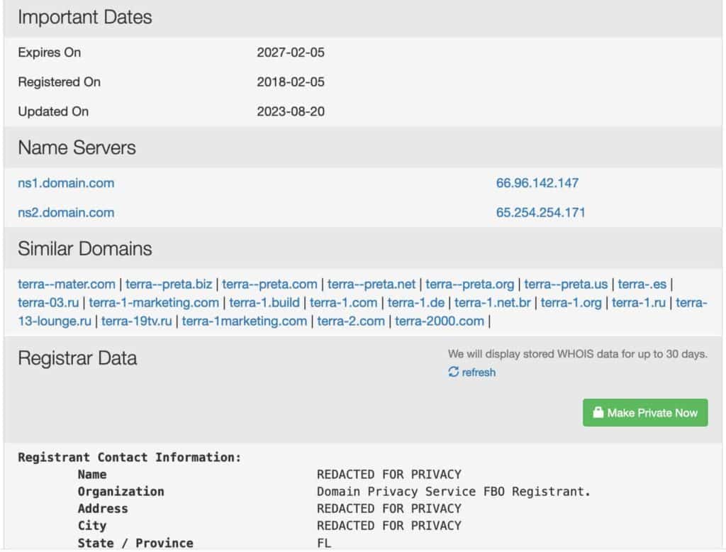 I dati provenienti da Finbold e il suo report su who.is indicano che l’ultimo aggiornamento del dominio è avvenuto il 20 agosto. Tuttavia, la scadenza è programmata per il 2027, considerando che il dominio è stato registrato nel 2018.