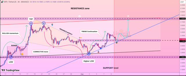 Una volta avviato il movimento, è previsto un aumento del 20% che potrebbe portare il prezzo fino a $3,8. Qui si trova la prossima importante resistenza per XRP dopo il completamento della rottura.