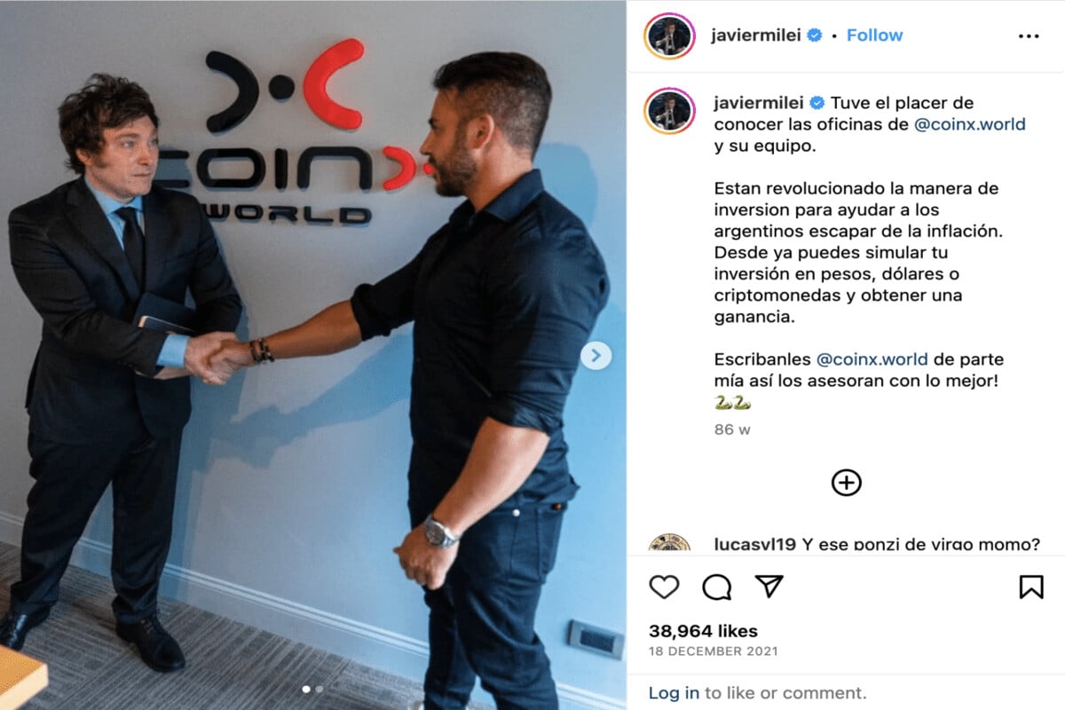 Milei, attraverso i suoi canali di comunicazione ha supportato attivamente la piattaforma ma dopo i reclami da parte degli investitori, l’autorità di regolamentazione argentina ha ordinato la chiusura. Molti investitori affermano di aver subito perdite per milioni di pesos a causa di Coinx e vorrebbero un risarcimento.