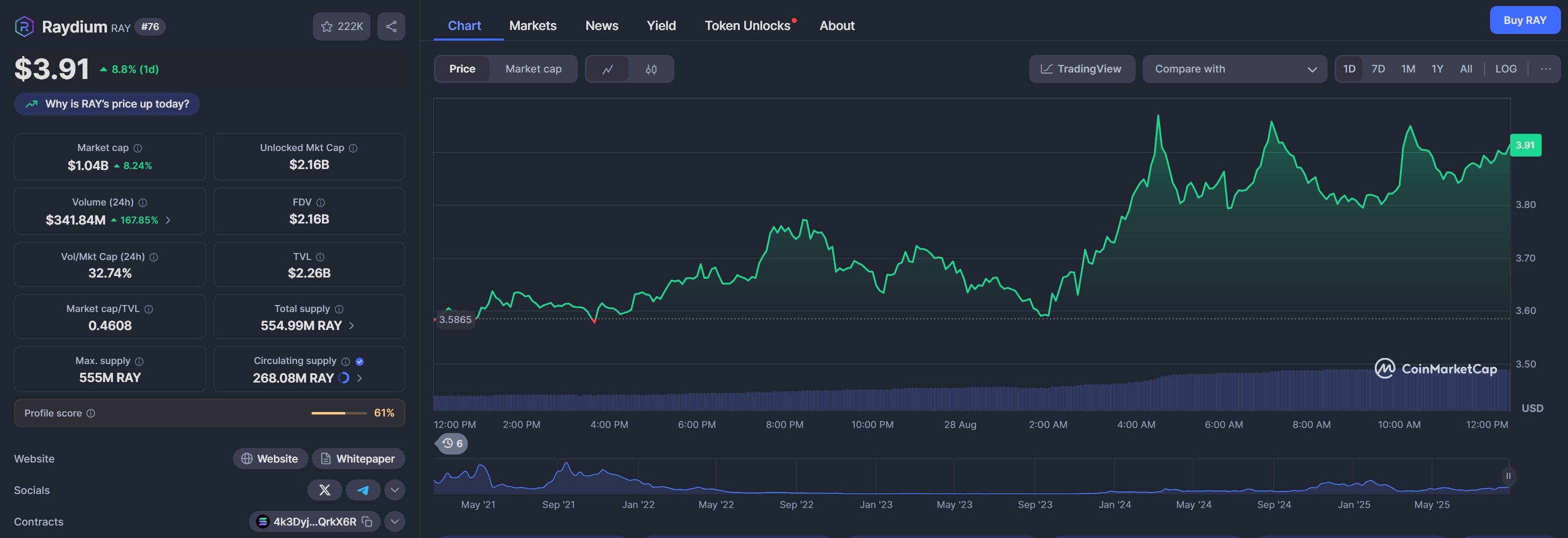 La scorsa settimana il prezzo di RAY è balzato di oltre il 14% a 3,8 dollari, portando la capitalizzazione di mercato oltre il miliardo di dollari. Al momento della stesura dell’articolo, il token RAY ha raggiunto il prezzo di 3,91 dollari, con un volume di scambi superiore ai 341 milioni di dollari e un TVL di 2,26 miliardi di dollari, collocandosi sicuramente al vertice di Solana.
