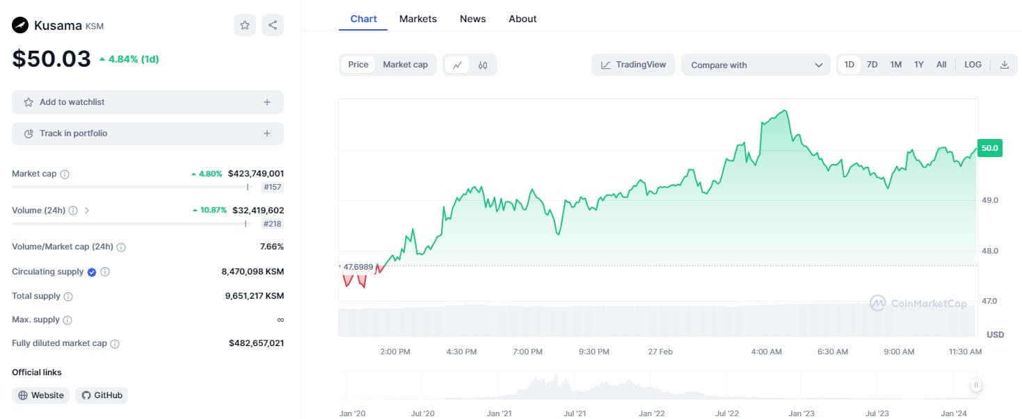 Secondo i dati di CoinMarketCap, al momento della stesura dell’articolo il prezzo di KSM è salito del 4,84% nelle ultime 24 ore, scambiando a 50,03 dollari. Ottima la traiettoria del prezzo quindi, che ha registrato anche un incremento del 5,93% negli ultimi 7 giorni e del 32,77% negli ultimi 30 giorni.