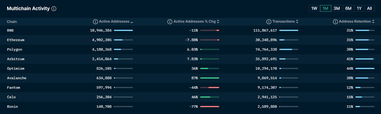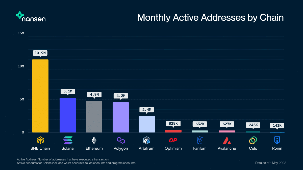 Secondo la piattaforma di analisi on-chain Nansen, BNB Chain ha avuto il maggior numero di indirizzi attivi nel mese di aprile: 10,9 milioni.
