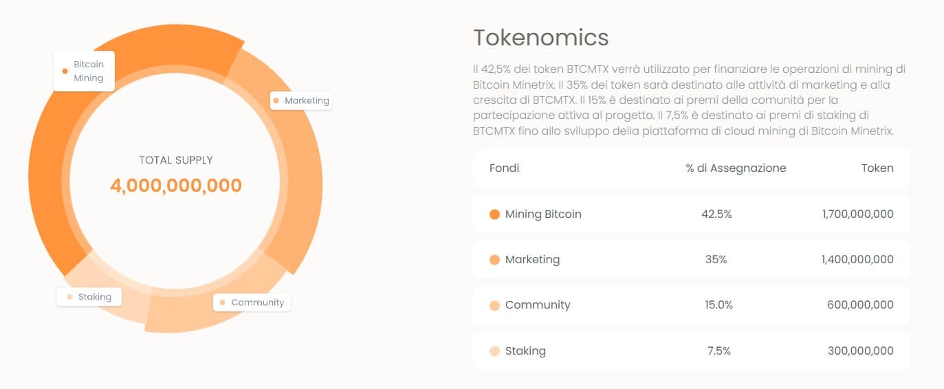 BTCMTX ha una fornitura totale di 4.000.000.000 (4 miliardi) di token. Il 42,5% (1.700) verranno utilizzati per il mining, il 35% (1.400) per il marketing, il 15% (600) andrà alla community, mentre il rimanente 7,5% (300) verrà destinato alla staking.