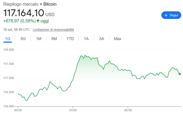 Ma qualcosa di interessante sta accadendo nelle prime ore di oggi, giovedì 18 settembre. I futures sia dell’S&P 500 sia del Nasdaq, a forte componente tecnologica, sono in rialzo. Inoltre Bitcoin – che, durante la conferenza stampa del presidente della Fed, Jerome Powell, stava scendendo sotto i 115.000 dollari – nelle ore successive è rapidamente risalito verso i 118.000 dollari, per poi stabilizzarsi attorno ai 117.000 dollari.