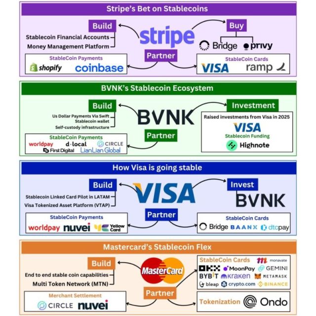 Oggi però prendiamo in considerazione il loro impatto sui pagamenti globali, che hanno scatenato l’interesse dei grandi player. In particolare, i grandi colossi come Visa, Mastercard, Stripe e BVNK, si stanno muovendo già da diverso tempo e con strategie diverse.