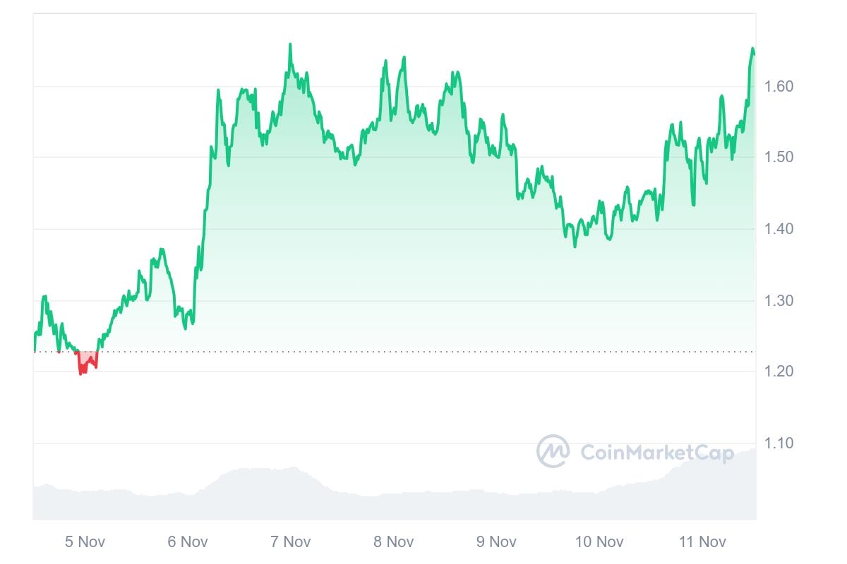 Nel momento in cui scriviamo sta scambiando a 1,64 dollari, con un guadagno del 13% in 24 ore. Nel grafico settimanale ha accumulato un aumento del 34,23%.