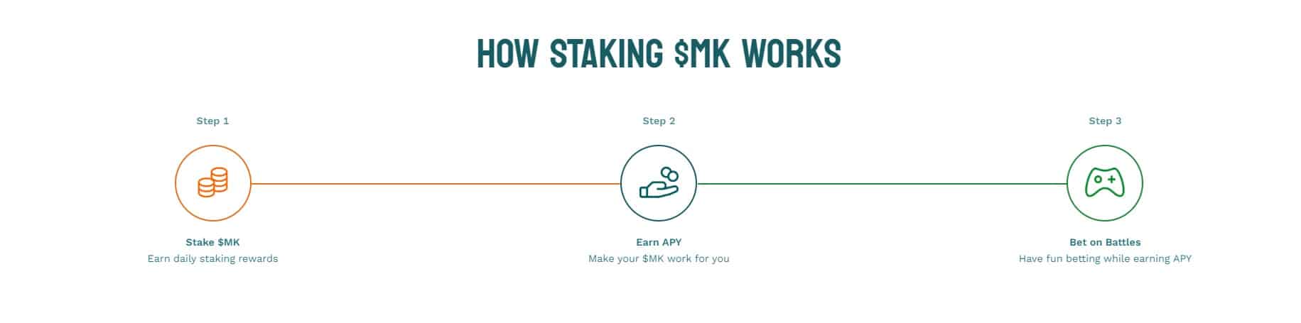 Oltre a vincere i premi nel caso si riesca a piazzare la scommessa vincente, i giocatori su Meme Kombat possono ottenere ricompense sullo staking del token nativo della piattaforma e mirare a un interessante ricompensa del 112% annuo.