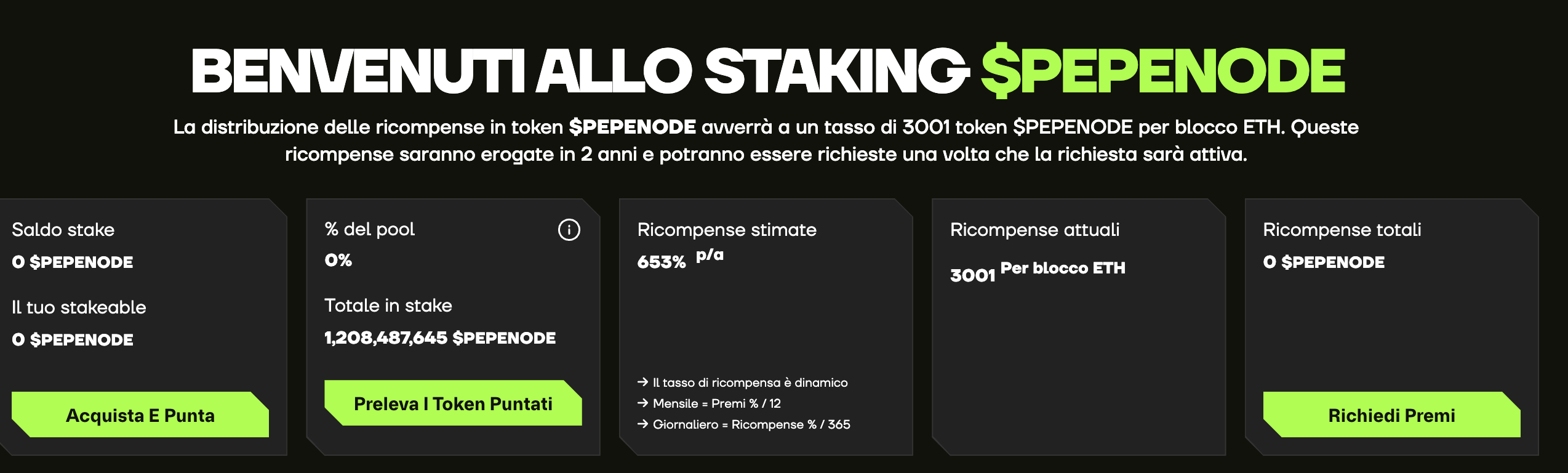 Per iniziare a guadagnare PEPENODE in modo passivo è possibile mettere in staking il token fin da subito.