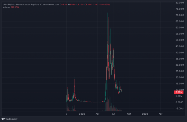Il token ha debuttato ufficialmente a marzo 2025, arrivando a una capitalizzazione di quasi 15 milioni di dollari. Dopo un breve ritracciamento, il prezzo è salito ancora spingendosi fino a 20 milioni, prima di vivere un lungo periodo di declino che sembrava lasciar presagire al peggio. E invece, in piena estate, arriva la sorpresa: LABUBU mette a segno un +12.000% dal suo minimo locale, arrivando a sfiorare i 75 milioni di market cap.