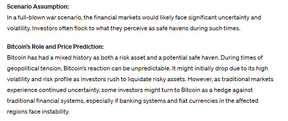 Immaginando il peggiore scenario possibile, in cui l’attacco di sabato fosse un presagio di guerra imminente, la piattaforma di intelligenza artificiale (AI) di riferimento di OpenAI, ChatGPT ha formulato alcune ipotesi. Secondo l’AI il valore di Bitcoin potrebbe crollare in un primo tempo e scendere a circa 60.000 dollari.