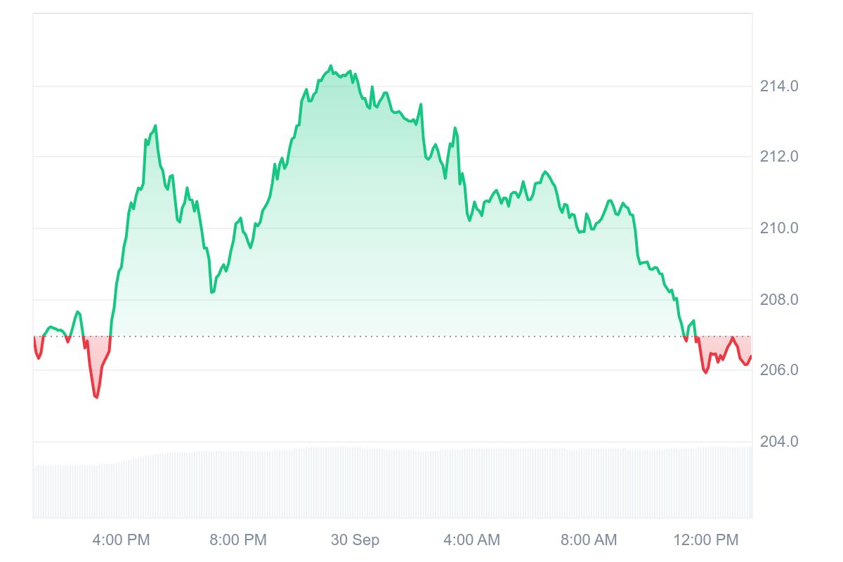 Al momento SOL sta scambiando a 206 dollari, con un ribasso dello 0,38 % nelle ultime 24 ore. Anche nel grafico settimanale è in rosso con una perdita del 5%, mentre in quello mensile è in verde con un guadagno dell’1,35%.