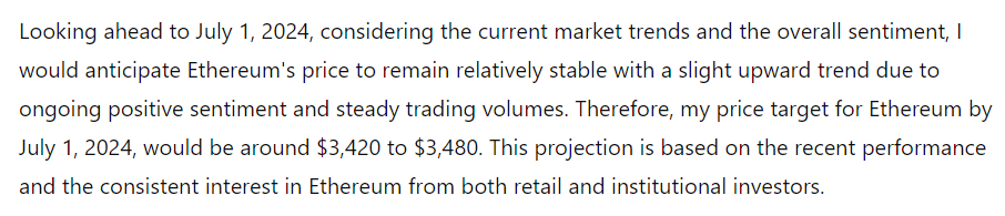 Dato che il 25 giugno c’è stata un’altra inversione di tendenza che ha portato al ribasso numerose criptovalute, abbiamo deciso di consultare alcune delle principali piattaforme di intelligenza artificiale (AI) per capire dove potrebbe trovarsi Ethereum il 1° luglio 2024.