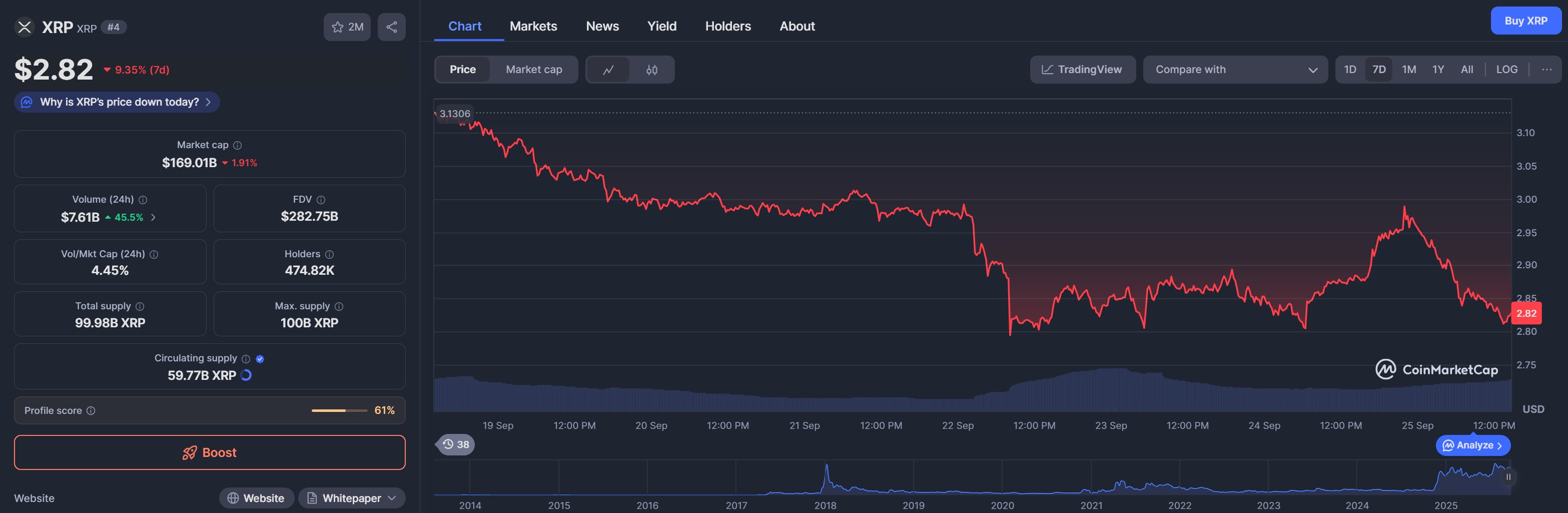 Il token di Ripple, che attualmente viene scambiato a 2,82 dollari, ha perso oltre il 9,35% nell’ultima settimana, cancellando oltre 17 miliardi di dollari dalla sua capitalizzazione di mercato.