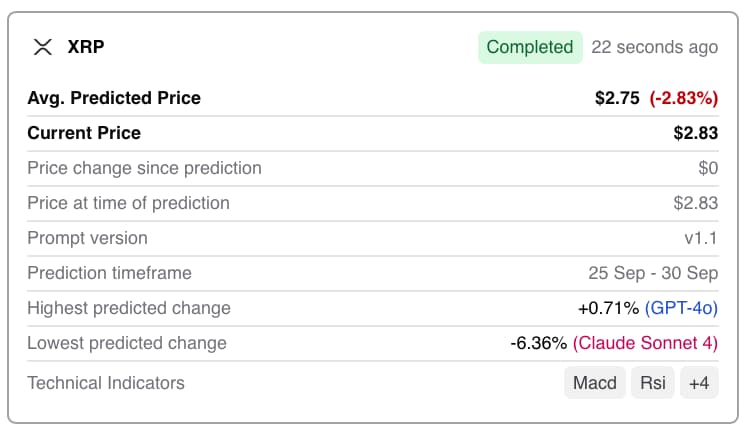 Un algoritmo che combina diversi strumenti di modelli linguistici di grandi dimensioni (LLM) e indicatori basati sul momentum, ha generato una previsione combinata per il prezzo di XRP alla fine del trimestre. Il sistema prevede un prezzo medio di 2,75 dollari, il che implica un calo del 2,83% rispetto ai livelli attuali.