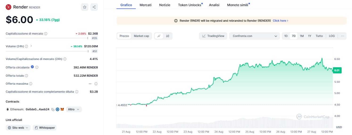Nel frattempo, secondo le informazioni del grafico più recente recuperato di CoinMarketCap, al momento della stesura dell’articolo RENDER era scambiata al prezzo di 6,00 dollari, registrando un calo del 2% nelle ultime 24 ma un aumento del 33,18% nell’ultima settimana e una riduzione delle sue perdite mensili al 6,02%.