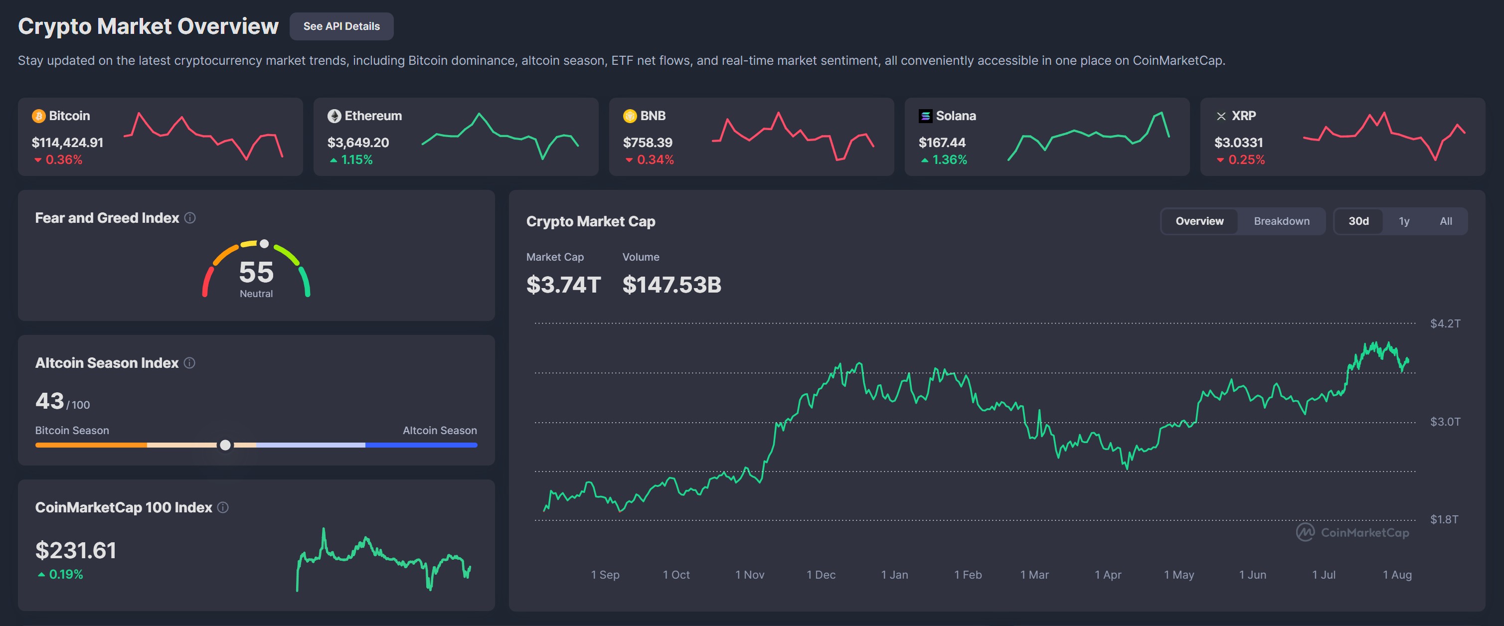 Il mercato delle criptovalute sta attualmente affrontando una fase di resistenza. Secondo i dati di CoinMarketCap, il valore totale di mercato è attualmente pari a 3,74 trilioni di dollari, con un guadagno di circa 40 miliardi di dollari nelle ultime 24 ore.