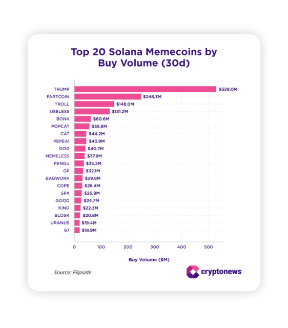 Osservando i dati si nota subito che un asset sta guidando il segmento. Tra le cinque meme coin su Solana con il maggior volume di acquisti, la meme coin coin del tycoon $TRUMP domina la scena con più di 529 milioni di dollari di afflussi in 30 giorni, lasciando il resto del comparto molto indietro.