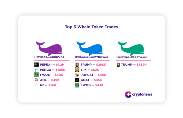 La prima balena è la più attiva, con più di 1,2 milioni di dollari investiti in PEPEAI, seguiti da posizioni minori in PENGU, FWOG, AOL e 67.