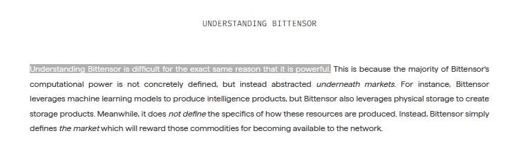 “Comprendere BitTensor è difficile, per lo stesso motivo per cui è potente. Infatti, la maggior parte della potenza di calcolo di BitTensor non è concretamente definita… Ad esempio, BitTensor sfrutta i modelli di apprendimento automatico per produrre prodotti di intelligenza, ma sfrutta anche lo storage fisico per creare prodotti di storage“.