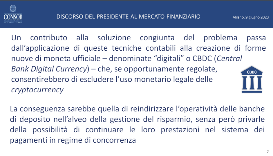 La slide successiva pone invece l’attenzione sulle CBDC, ovvero le stable coin emesse dalle banche centrali. Come accade in molti altri Paesi, Savona è favorevole al loro utilizzo, anche perché a suo dire potrebbero in qualche modo “tagliare fuori” altri criptovalute: “escludere l’uso monetario legale delle cryptocurrency.