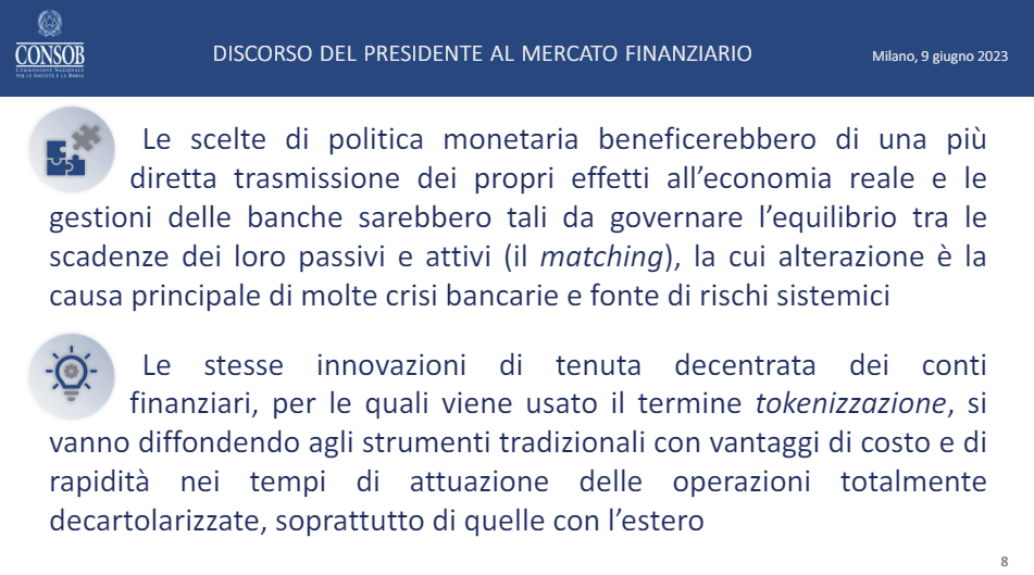 La slide successiva è un capolavoro di burocratese, e sinceramente anche in questo caso risulta difficile capirne il senso. La prima parte sembra un riferimento alla digitalizzazione e all’utilizzo di CBDC che potrebbero favorire un maggiore equilibrio. La seconda parte parla invece di tokenizzazione, un argomento molto in voga nel settore delle criptovalute soprattutto per i suoi risvolti finanziari.