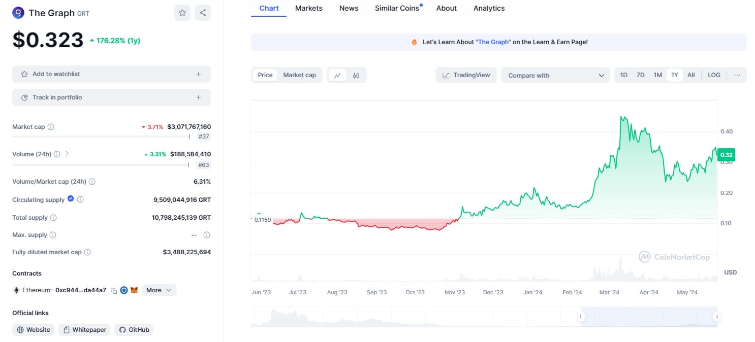 La criptovaluta nativa della piattaforma, il token GRT, ha registrato un aumento di prezzo del 176,28% nell’ultimo anno, adesso è scambiato al prezzo di 0,323 dollari.