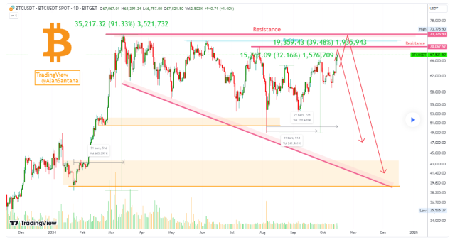 In particolare, il recente slancio che ha visto il Bitcoin superare i 65.000 dollari sembra essere una Bull Trap, segnalando una correzione inversa, almeno secondo Alan Santana che ha illustrato i suoi timori in un post su TradingView.