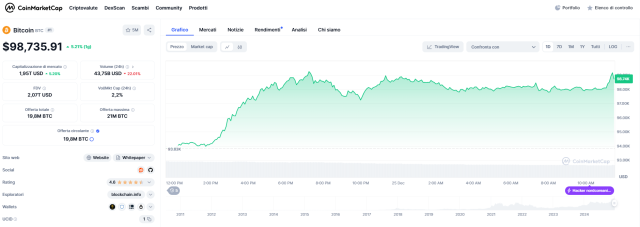 Nel momento in cui scriviamo BTC + a quota 98.735 dollari, con un guadagno giornaliero del 5% secondo il grafico di CoinMarketCap.