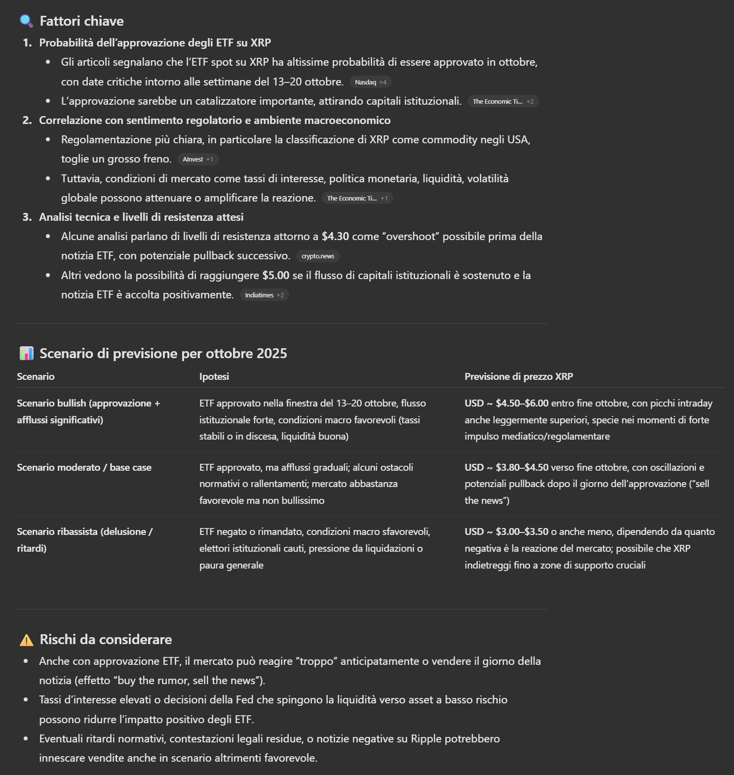 Diversi analisti di criptovalute stanno ora utilizzando modelli di intelligenza artificiale come ChatGPT per analizzare le previsioni sul prezzo di XRP. Questi modelli indicano ulteriori aumenti per ottobre, sulla base dei pattern storici degli ETF e dei dati sull’adozione istituzionale.