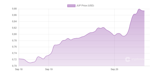 Anche il token nativo di Jupiter, JUP, ha registrato un notevole aumento. Nelle ultime 24 ore, JUP è salito dell’11,2%, raggiungendo un prezzo di 0,8762 dollari.