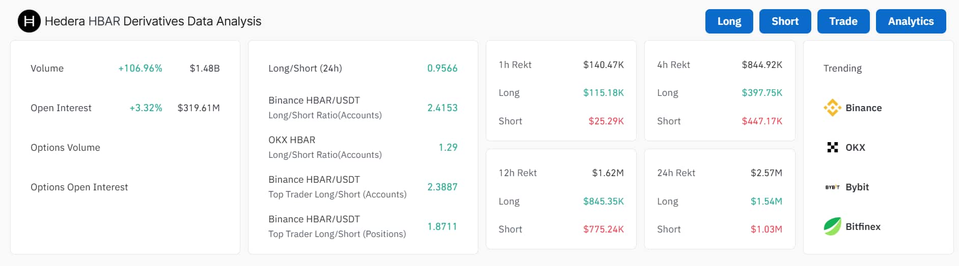 A supportare lo slancio rialzista di HBAR sono anche gli indicatori tecnici e l’aumento dell’attività nei mercati dei derivati. Secondo i dati della piattaforma CoinGlass, il volume di trading ha registrato un forte aumento del 106,96%, arrivando a 1,48 miliardi di dollari, mentre l’Open Interest è salito del 3,32%, toccando i 319,61 milioni di dollari, confermando la crescente fiducia degli investitori e partecipazione degli operatori. Inoltre, sull’exchange Binance, il rapporto Long/Short si attesta a 2,4153, indicando una netta preferenza per le posizioni long.