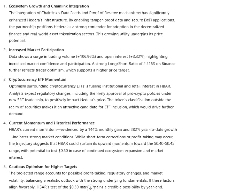 Per capire il possibile andamento di HBAR nelle prossime settimane, abbiamo consultato il modello di intelligenza artificiale ChatGPT-4o. L’AI stima che l’asset chiuderà l’anno scambiando tra 0,40 e 0,45 dollari. Si tratta una previsione prudente che tiene conto di potenziali prese di profitto e correzioni.