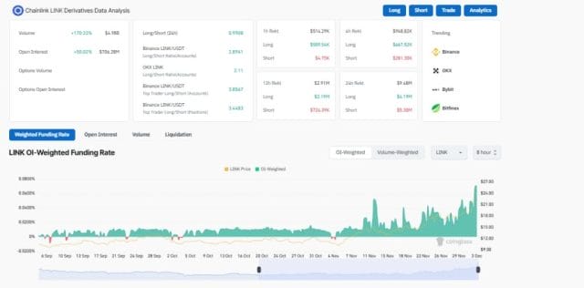 I dati sui derivati di CoinGlass delineano un sentiment rialzista per Chainlink, basato su metriche chiave di mercato. L’open interest è aumentato del 50,02%, raggiungendo $706,28 milioni, accompagnato da un incremento massiccio del volume di trading del 170,22%, toccando $4,98 miliardi. Queste metriche indicano una forte attività dei trader e un notevole interesse di mercato.