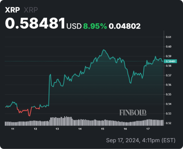 Questo movimento di prezzo riflette un sentimento rialzista intorno a XRP, considerando che la media mobile semplice (SMA) a 50 giorni è $0,5662, mentre la SMA a 200 giorni è leggermente inferiore a $0,5477. Con il prezzo attuale sopra entrambe le medie mobili, XRP potrebbe accumulare slancio per una significativa crescita di valore.