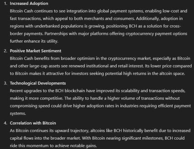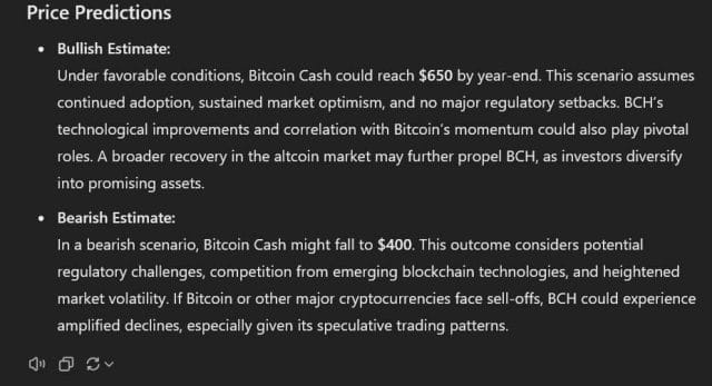 Nel caso ottimistico, il modello AI ha stimato che BCH potrebbe raggiungere un prezzo massimo di $650 entro la fine dell’anno.
