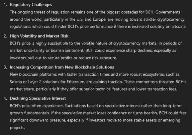 Il terzo punto del modello AI, però, ha un peso maggiore. Il modello ha fatto riferimento alla crescente concorrenza da parte di rivali come Solana (SOL) o le soluzioni layer 2 basate su Ethereum (ETH). In particolare, Solana consente transazioni ancora più veloci ed economiche, il che ne fa il principale concorrente di BCH.