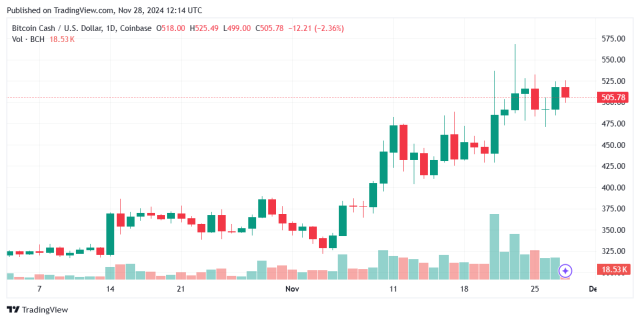 Eppure, BCH ha ottenuto ottimi risultati nel corso del 2024. Oggi un BCH vale $503, pressoché stabile nelle 24 ore ma in aumento del 43,49% in un mese. Il rendimento da inizio anno (YTD) è del 94,76%.