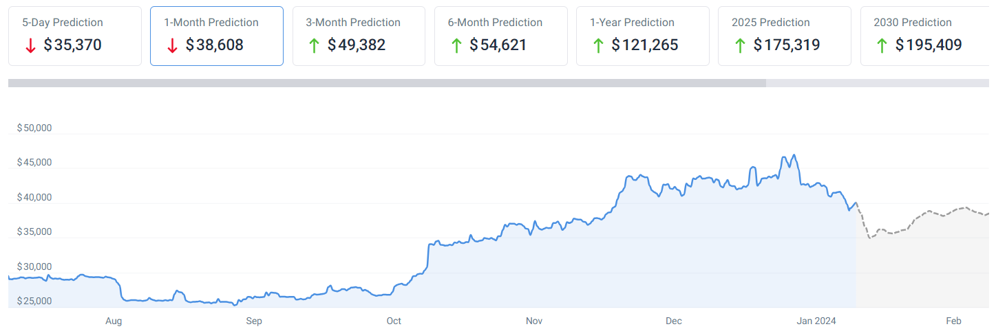 Abbiamo interrogato l’intelligenza artificiale e gli algoritmi avanzati di previsione dei prezzi per elaborare una stima dell’andamento del prezzo di Bitcoin. Secondo il sito di analisi e previsione del mercato delle criptovalute CoinCodex il prezzo di Bitcoin potrebbe persino scendere a 35.370$ entro l’1 febbraio 2024.