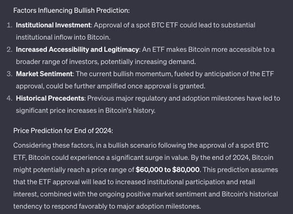 Considerando fattori come l’aumento degli investimenti istituzionali, la maggiore accessibilità, la legittimità e i precedenti storici, se un ETF verrà approvato negli Stati Uniti, ChatGPT prevede che Bitcoin raggiungerà un prezzo tra 60.000 e 80.000 dollari.